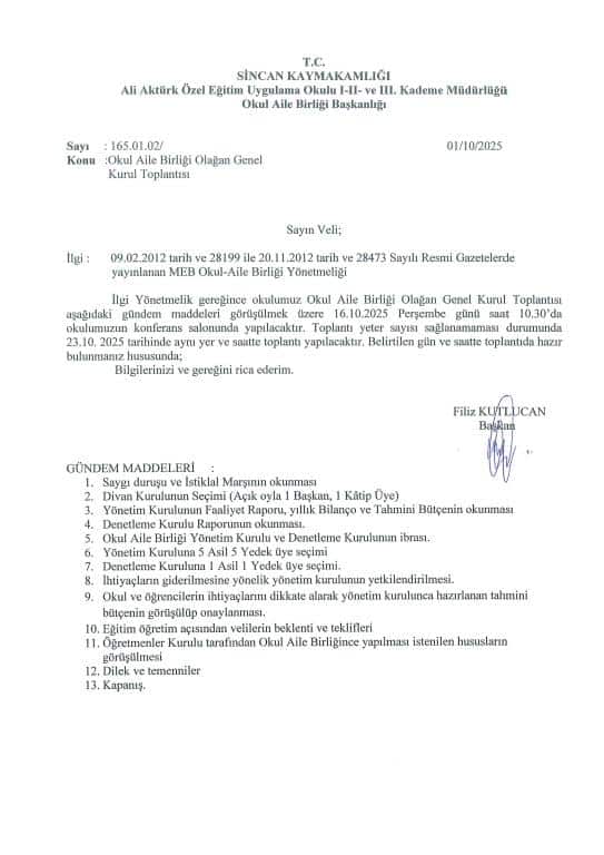 Okulumuz Okul Aile Birliği Olağan Genel Kurul Toplantısı 16.10.2025 Perşembe günü saat 10.30’da okulumuzun konferans salonunda yapılacaktır. Toplantı yeter sayısı sağlanamaması durumunda 23.10.2025 tarihinde aynı yer ve saatte yapılacaktır.